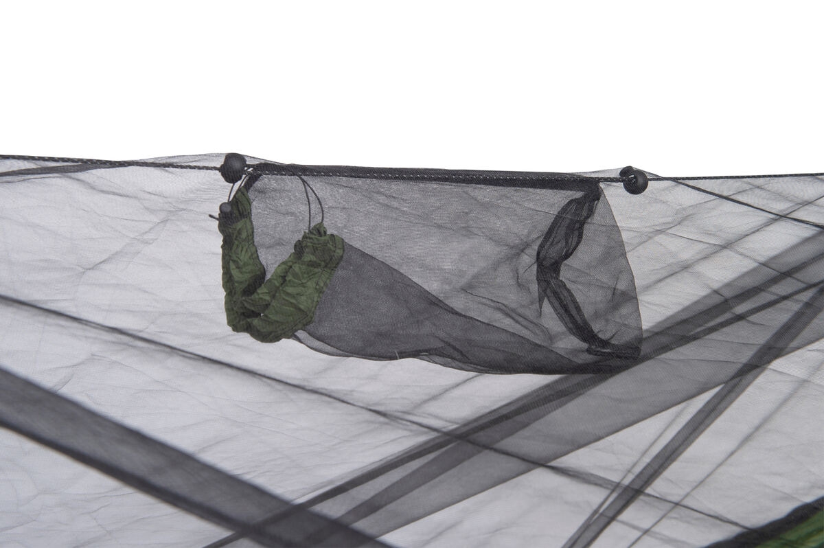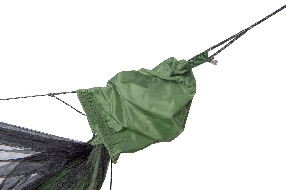 Of het nu gaat om vliegende insecten zoals muggen of kruipende indringers zoals teken en mieren, deze hangmat biedt volledige bescherming. De dubbele rits aan één zijde maakt instappen eenvoudig en veilig. Wil je de hangmat zonder muskietennet gebruiken, dan verwijder je eenvoudig de spreidstokken en draai je het liggedeelte om, waarna het net netjes onder de hangmat blijft hangen.