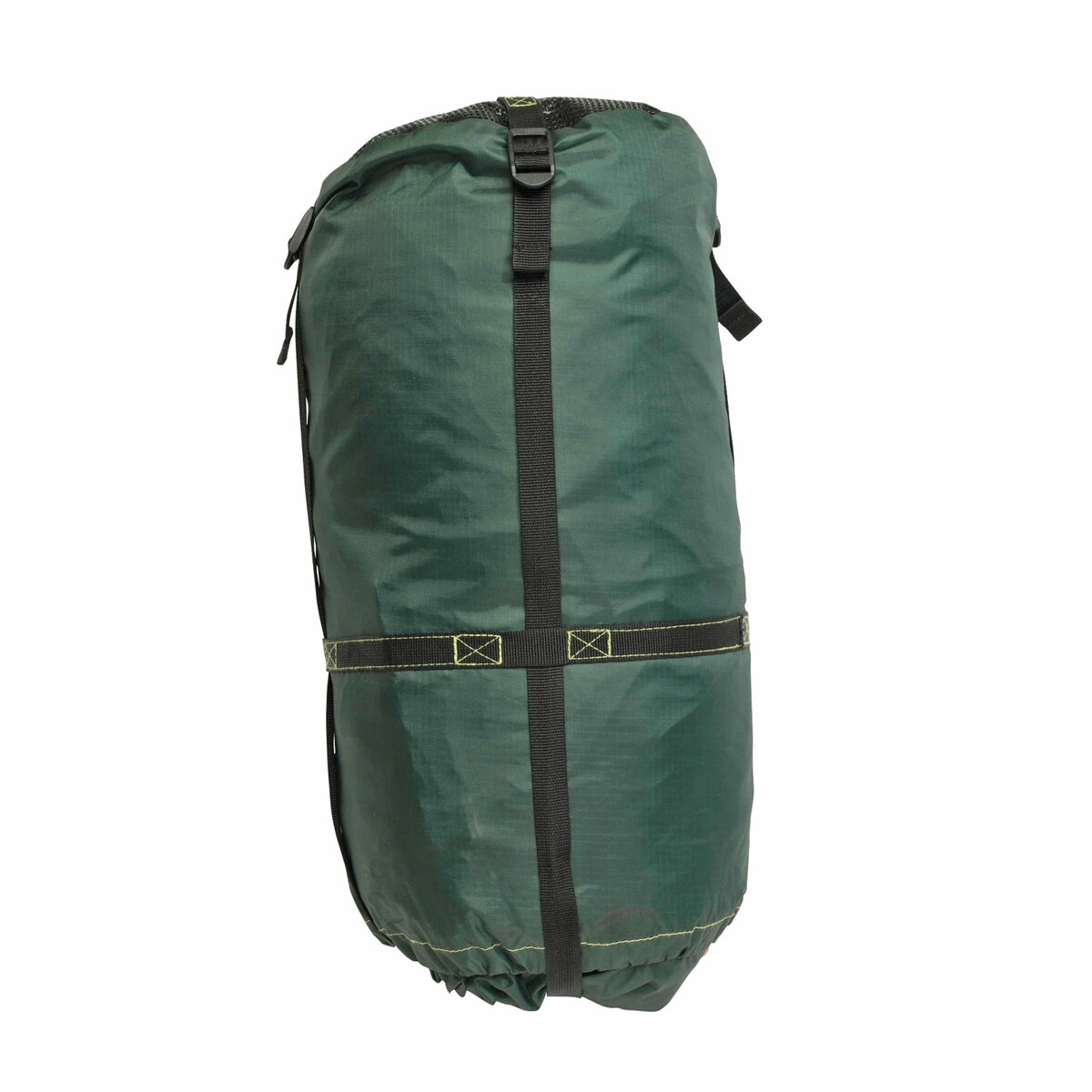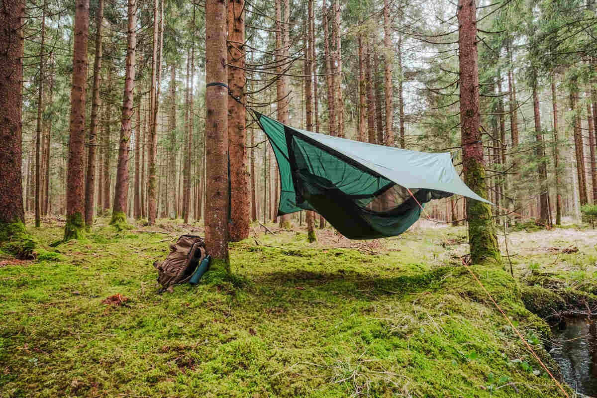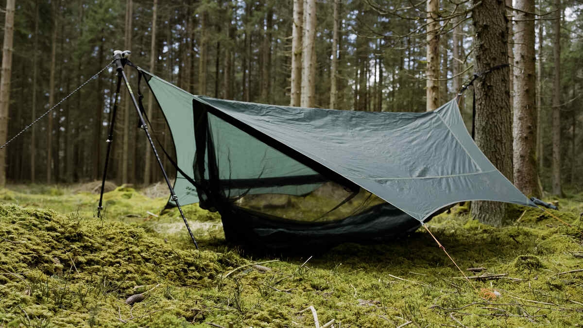 De Traveller Camp is veelzijdig in gebruik. Je kunt hem niet alleen als hangmat gebruiken, maar ook als tarp-opstelling. Door de hangmat omhoog te trekken en onder de tarp op te bergen, creëer je eenvoudig een beschutte plek tegen regen. Heb je geen geschikte bomen in de buurt, dan kun je de set ook op de grond gebruiken door de bevestigingspunten vast te maken aan bijvoorbeeld takken of wandelstokken.