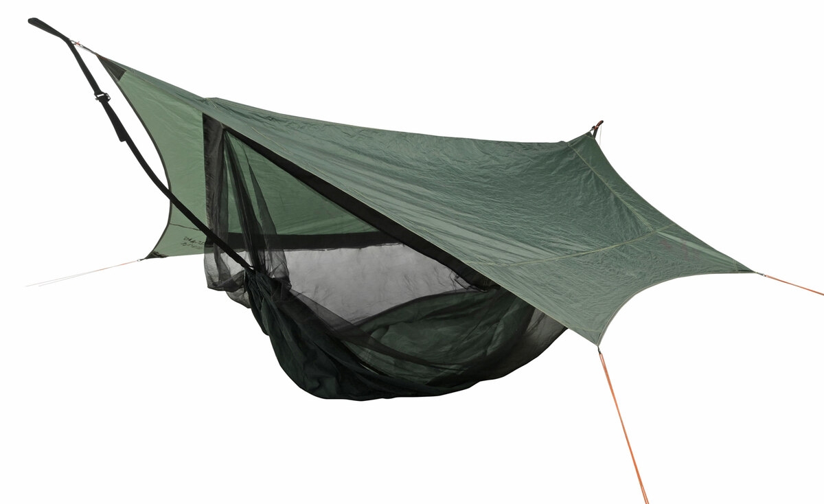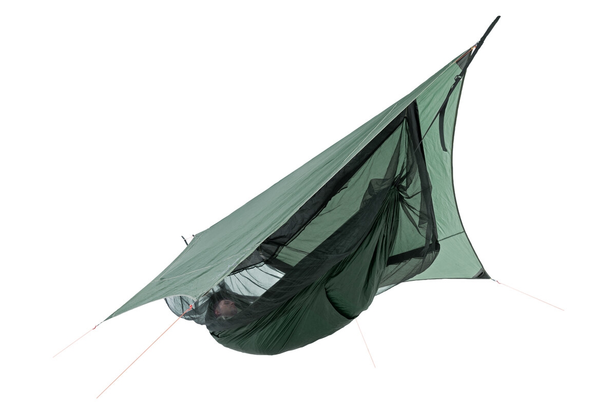 De Amazonas Traveller Camp wordt geleverd met geïntegreerde tarp, inclusief muskietennet en ophangbanden. Bevestigingsmateriaal voor bomen wordt niet meegeleverd.