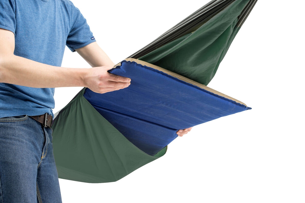 Voor extra comfort bij lagere temperaturen beschikt de hangmat over een geïntegreerd thermovak aan de onderzijde. Dit vak is speciaal ontworpen voor het plaatsen van een isolatiemat, zodat je beschermd bent tegen kou van onderaf. In tegenstelling tot losse matten die kunnen verschuiven, blijft de mat stevig op zijn plek. Geschikt voor standaard trekkingmatten met afmetingen van ongeveer 183 x 51 centimeter of 198 x 65 centimeter, maar ook dikkere luchtmatrassen tot 7 centimeter passen in het compartiment. Door deze licht onder op te pompen vormen ze zich beter naar het lichaam, wat het ligcomfort aanzienlijk verhoogt.