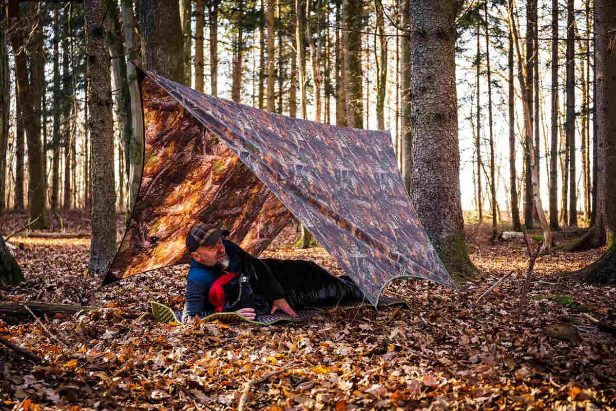De forest-uitvoering is ontworpen voor optimale camouflage in vrijwel elk seizoen. Het patroon van bladeren en bomen, gecombineerd met natuurlijke boskleuren, zorgt ervoor dat de tarp vrijwel opgaat in de omgeving. Hierdoor blijf je onopvallend in het landschap en wordt je silhouet visueel verzacht, wat ideaal is voor natuurliefhebbers die discreet willen kamperen.