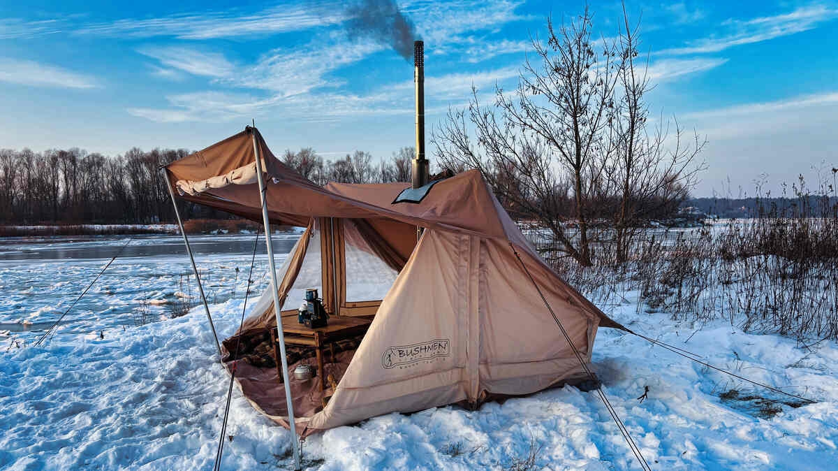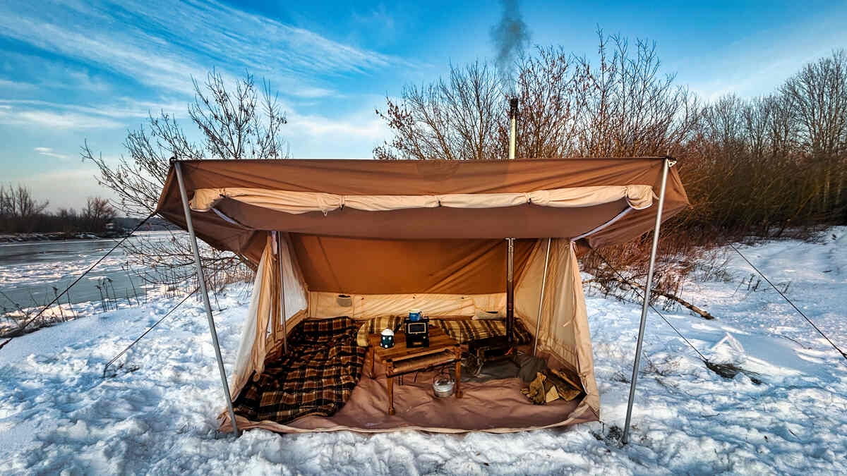Het ontwerp is geïnspireerd op de historische tenten van houthakkers, trappers en pelsjagers uit de negentiende eeuw. Dit zie je terug in de praktische indeling en het gebruik van duurzame materialen. De tent is gemaakt van technische katoen, een sterke mix van katoen en polyester die ademt, vocht afvoert en tegelijkertijd warmte vasthoudt. Hierdoor heb je geen last van condensvorming en blijft het binnenklimaat aangenaam, zelfs tijdens koude of natte omstandigheden. Bovendien droogt het materiaal snel en is het lichter dan traditioneel canvas.