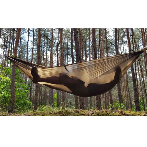De hangmat is gemaakt van ultralicht ripstop nylon van 20D. Dit materiaal voelt prettig aan, is ademend en tegelijkertijd verrassend sterk. Ondanks het extreem lage gewicht kan deze hangmat een statische belasting aan tot 130 kilogram. De Dark Olive kleur zorgt ervoor dat de hangmat mooi opgaat in de natuurlijke omgeving, ideaal voor bushcraft, trekking en minimalistischer kamperen.
